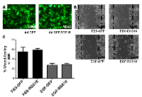 To test the hypothesis that RGS16 inhibits pancreatic cancer cell migration, we exogenously expressed RGS16 in BxPC-3, PANC-1, and AsPC-1 cells with an adenoviral vector and used wound healing assays to measure cell migration. We chose BxPC-3, PANC-1, and AsPC-1 because these three cell lines are derived from tumors with varying expression of RGS16, differentiation status, mutations, presence of metastases, and expression of Epidermal Growth Factor Receptor (EGRF, Table 2). We expressed RGS16 using adenoviral vector that contains RGS16 plus a GFP reporter (Ad.GFP.RGS16) and used a vector expressing only GFP (Ad.GFP) as the control. Expression of RGS16 protein correlated with GFP expression in cells treated with Ad.GFP.RGS16 (Supplementary Figure 1). Fluorescent microscopy was used to determine viral transduction prior to experiment (Figures 5a, 6a, and 7a). EGF was used to stimulate cell migration because EGFR is overexpressed in pancreatic cancer and is linked with development, invasion, and decreased survival in pancreatic cancer [32-34]. RGS16 significantly inhibited FBS- and EGF-induced migration of BxPC-3 cells and FBS-induced migration of AsPC-1 cells, but had no effect on FBS and EGF induced migration of PANC-1 cells (Figures 5-7).